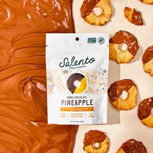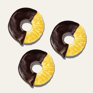 We begin by dehydrating our signature organic golden pineapples, regeneratively grown by small-scale farmers in Colombia. Next, we meticulously coat these flavorful slices in our smooth & rich Belgian Dark Chocolate blend, made from Heirloom Cacao Beans. The result is a delightful treat that's both indulgent and guilt-free.